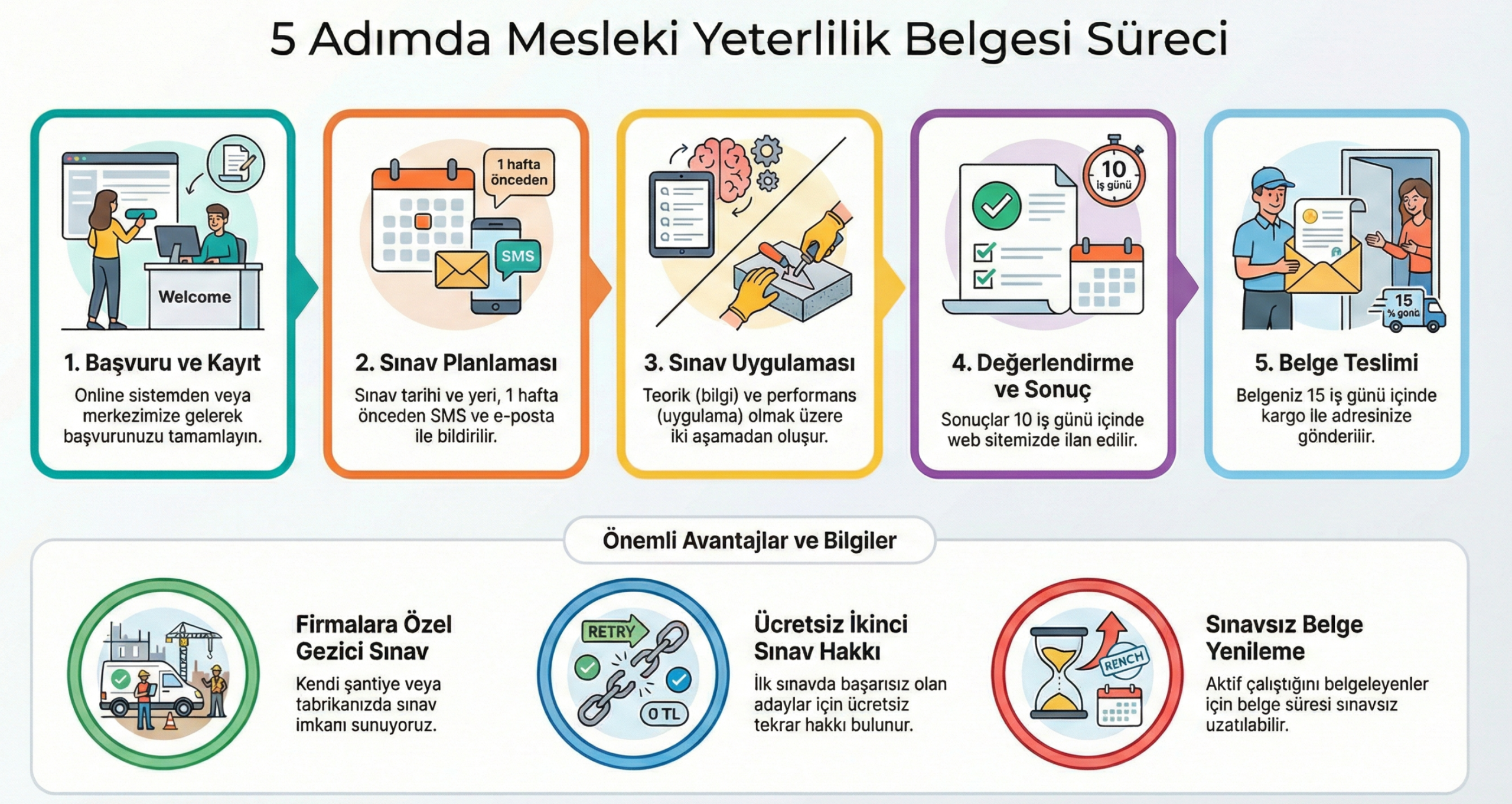 Başvurunuz onaylandıktan sonra, Mesleki Yeterlilik Kurumu (MYK) mevzuatına uygun olarak sınav programınız hazırlanır.